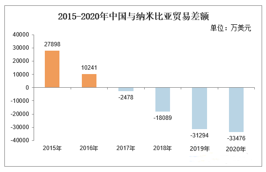 2020年中国与纳米比亚贸易差额为-33476万美元,2019年中国与纳米比亚贸易差额为-31294万美元。
