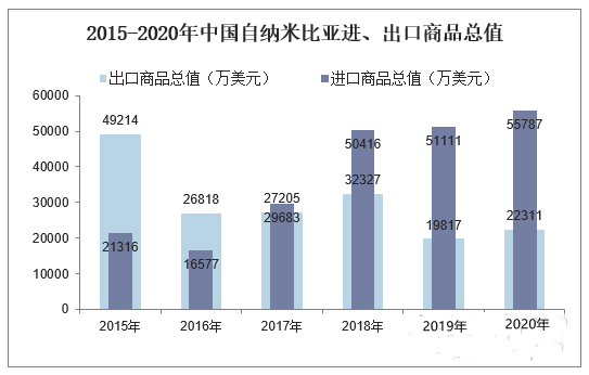 2020年中国对纳米比亚出口商品总值为22311.4万美元,相比2019年增长了2494万美元,同比增长12.6%;2020年中国自纳米比亚进口商品总值为55787.1万美元,相比2019年增长了4676万美元,同比增长9.1%。